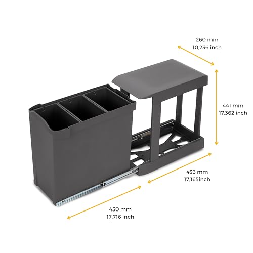 Emuca - Poubelles de recyclage pour la cuisine, 3 x 10L, fixation inférieure et extraction automatique, Acier et Plastique, Gris antracite