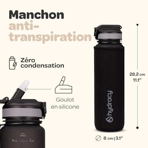 Hydracy Gourde d'Eau 1L sans BPA, Bouteille avec Marqueur de Temps, Paille et Verrouillage Sécurisé - Housse en Néoprène, Étanche, Anti-Fuite, Réutilisable, Légère - Idéal pour Sport, École, Travail