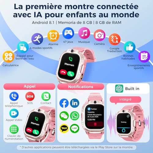 OIKKEI Montre Connectée GPS Enfant avec Téléphone, Appel Vidéo, ChatGPT, Chat Vocal, SMS, WiFi, SOS, 47 Jeux, Mode Scolaire, Sport, Podomètre, Cadeau Fille Garçon dès 4 Ans (Rose)